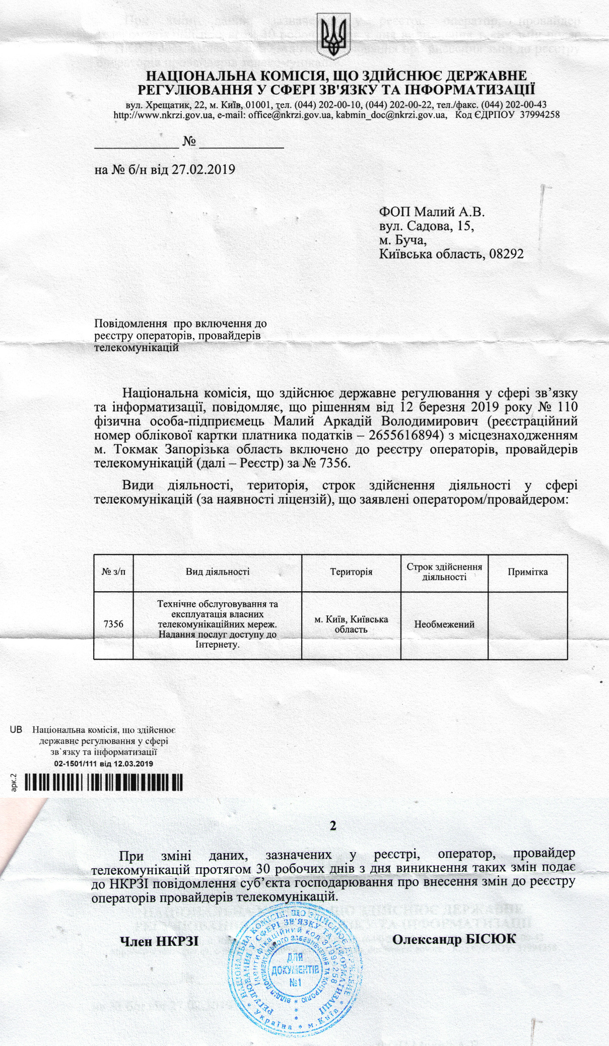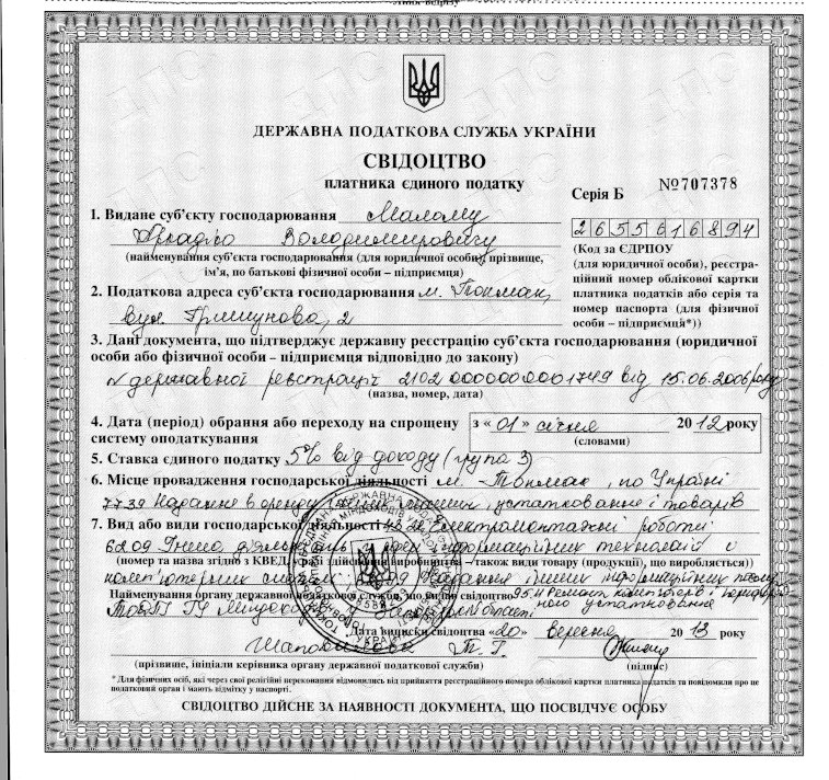 СПД-ФО Малий Аркадій Володимирович, який діє на підставі Свідоцтва про державну реєстрацію фізичної особи-підприємця серія В01 №020792 від 15.06.2006р., далі по тексту «Провайдер», з однієї сторони, та